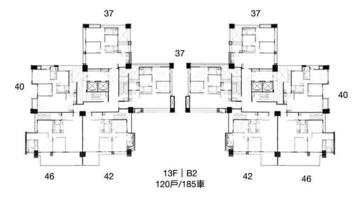 房型及坪數規劃:3房(37~46坪)
